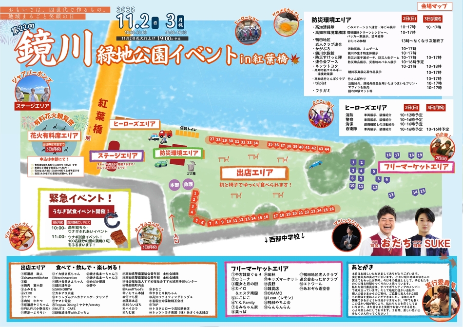 鏡川緑地公園にて行われる「鏡川緑地公園イベントin紅葉橋」は、テーマを「おもいでは、四世代で作るもの。地域まるごと笑顔の日」とし、よさこいや歌謡ショーなどが行われます。また命・家族・地域を守るとして防災環境エリアにて様々な作品展示もあります。